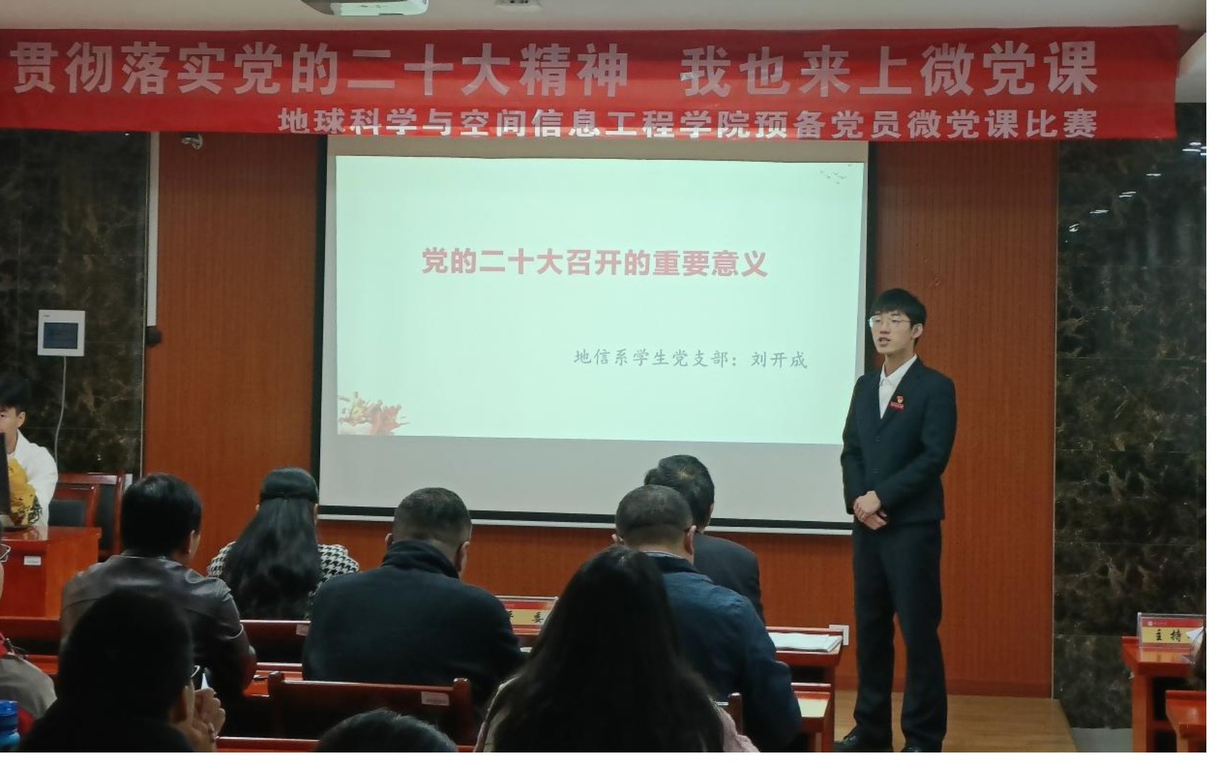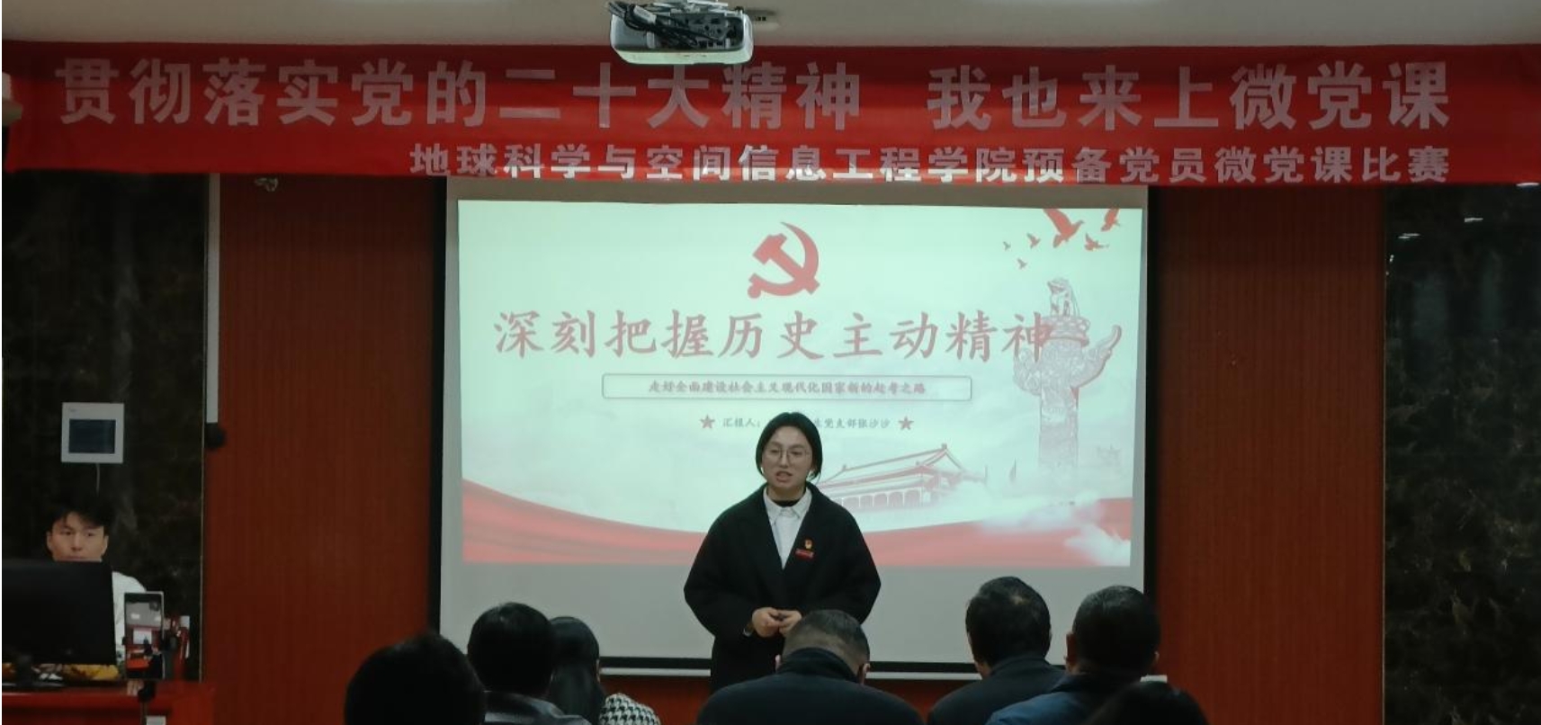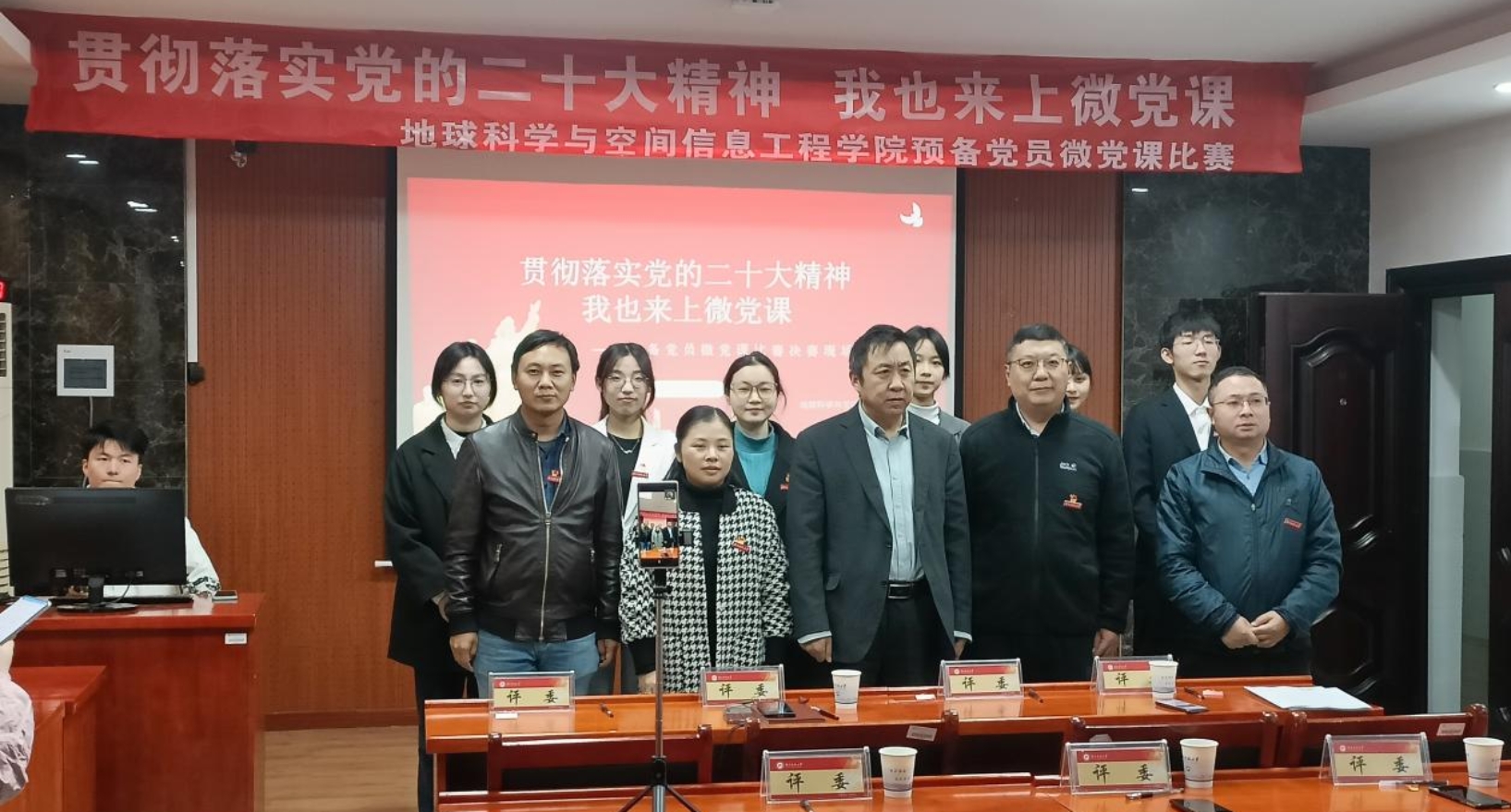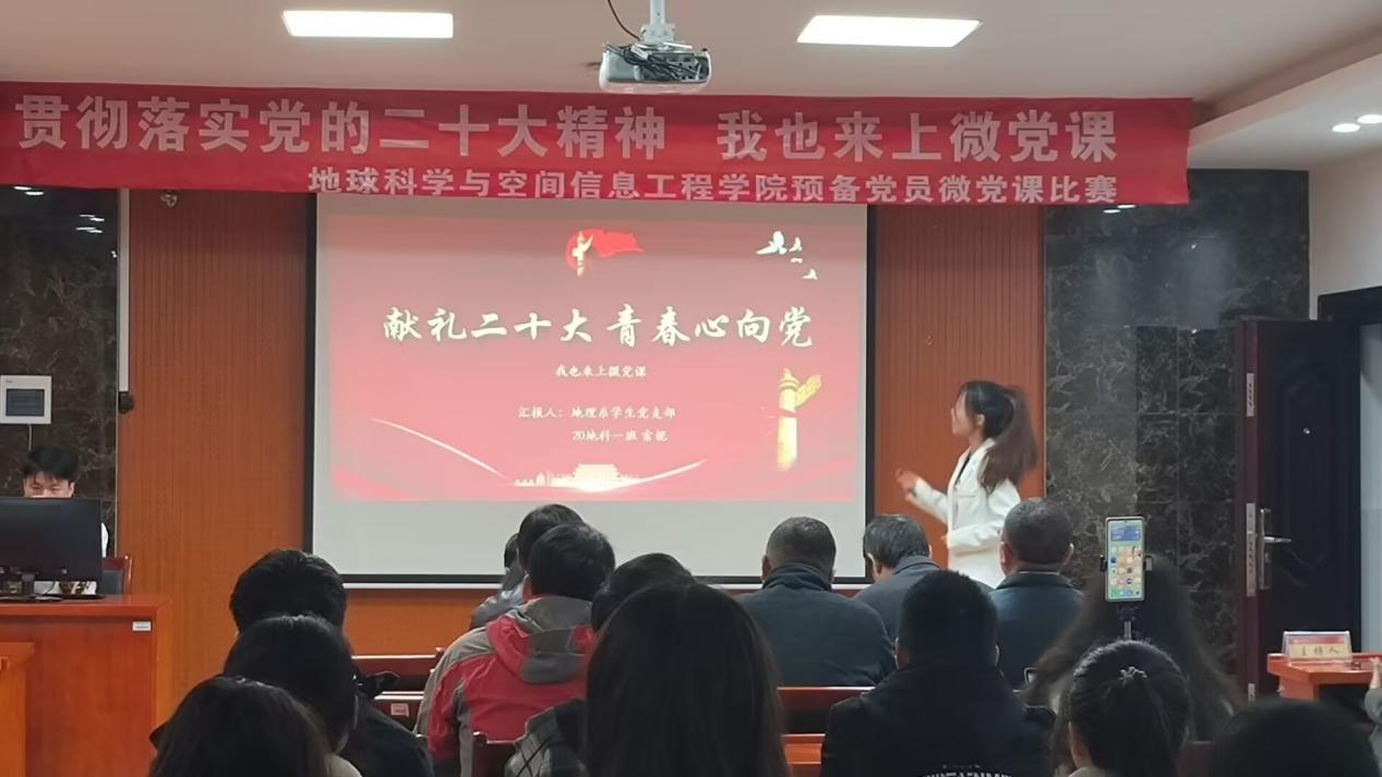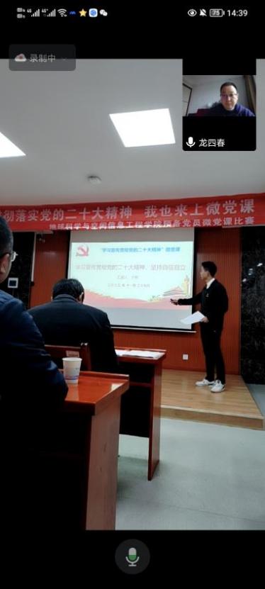 疫情的脚步并没有阻止我们前进的步伐,冬日凛冽的寒风伴舞着赛手们斗志昂扬的精神。为深入学习贯彻党的二十大精神,检验预备党员对二十大精神的领会,11月29日下午,秀人网 举办了线上线下的“贯彻落实党的二十大精神,我也来上微党课”比赛决赛活动。担任此次的评委有线上的秀人网 党委书记龙四春,有线下的秀人网 院长任伯帜、党委副书记罗玺、地理党支部书记李振国、地信系党支部书记陈新保、测绘系党支部书记张立亚、地空重点实验室党支部副书记唐志光。此次微党课比赛活动由秀人网 党委专职组织员刘俊策划组织,分初赛与决赛,今天下午的决赛由秀人网 学生党校管理部部长傅颖主持,党校工作人员、秀人网 全体预备党员参会。