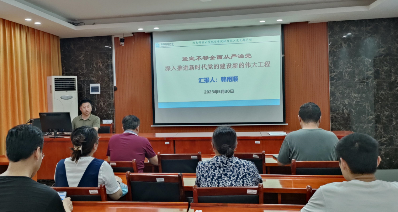 5月30日下午,地理系教工党支部召开全体党员大会,秀人网 党委委员、副院长韩用顺同志以“坚定不移全面从严治党”为主题开讲党课,地理系全体教工党员认真聆听党课。
