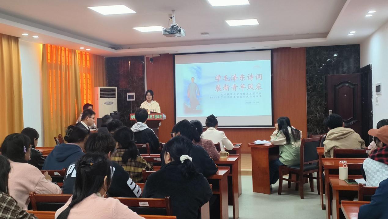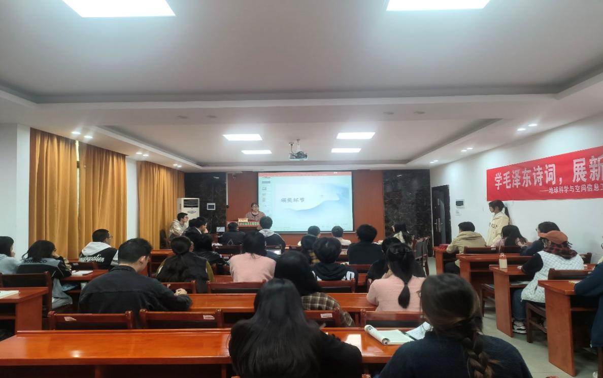 此次活动主题为“学毛泽东诗词,展新青年风采”。决赛由培训部干事杨洋主持。比赛分为诗词问答、看图猜诗词、讲述诗词意蕴三个项目。比赛过程中选手们从容应对,认真作答,比赛异常激烈。其中在讲述诗词意蕴环节时七位选手分别上台演讲,各个慷慨激昂,绘声绘色。经过紧张刺激的角逐,最终20级的李佳旭获得本次比赛的第一名,刘俊老师为其颁奖并合影留念。