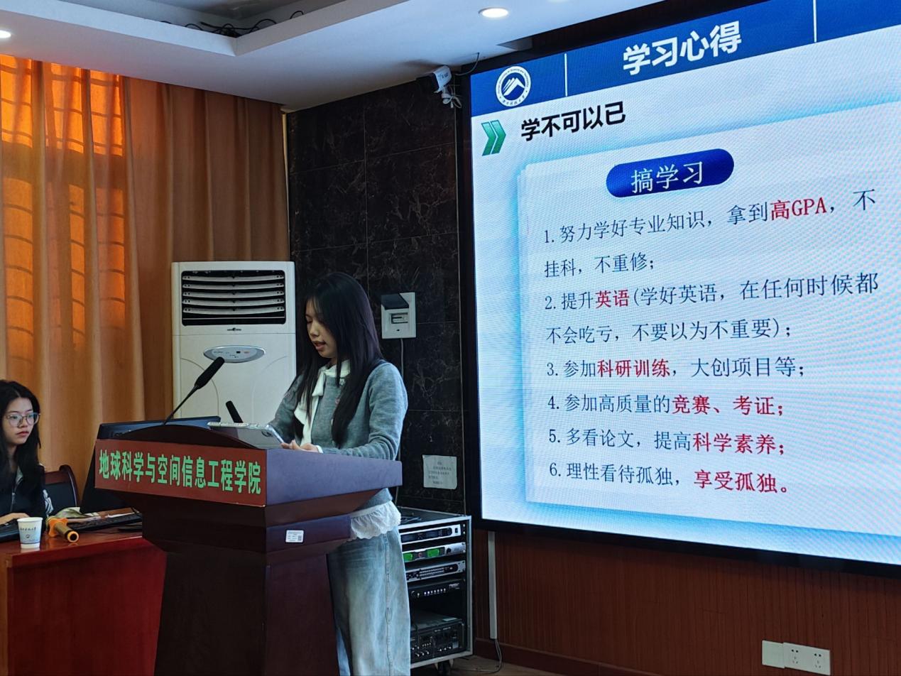 22级李谨逸的发言干货满满,围绕专业深耕、能力拓展与心态修炼三个维度展开。在专业学习方面,她建议同学们既要扎实掌握核心课程知识,也要主动探索跨学科关联内容,通过查阅文献、参与科研项目等方式深化对专业的理解。谈及能力拓展,她鼓励同学们积极投身学生工作、志愿服务等活动,在统筹协调、沟通表达中提升综合素养。同时,李谨逸同学也分享了自己的心态调节经验,强调要学会接纳不完美,合理规划时间、拒绝无效焦虑,以从容坚定的姿态在大学道路上稳步前行。