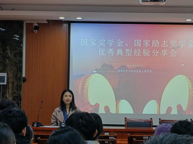 此次会议邀请了三位获得国家奖学金和国家励志奖学金的优秀学生代表,分享她们在学习、工作和生活中的体会和感受。她们分别是19级地理信息科学专业一班的石英杰,20级勘查技术与工程专业三班林琪,21级地理科学专业三班的高雨濛。