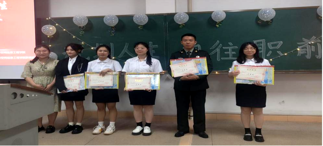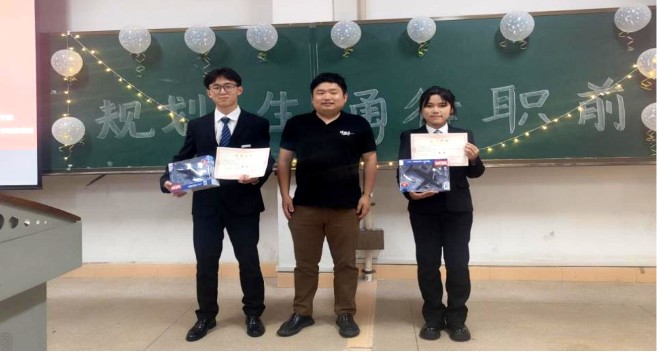 大赛最后,主持人邀请秀人网 辅导员吴汉老师发言。吴汉老师在讲话中对职规大赛的成功举办做了充分肯定,对获奖的选手表示祝贺,希望同学们能够发挥榜样力量,固化成果。最后由吴汉老师、邓雯璐老师、刘炯老师分别为获奖同学颁发奖状和礼品。