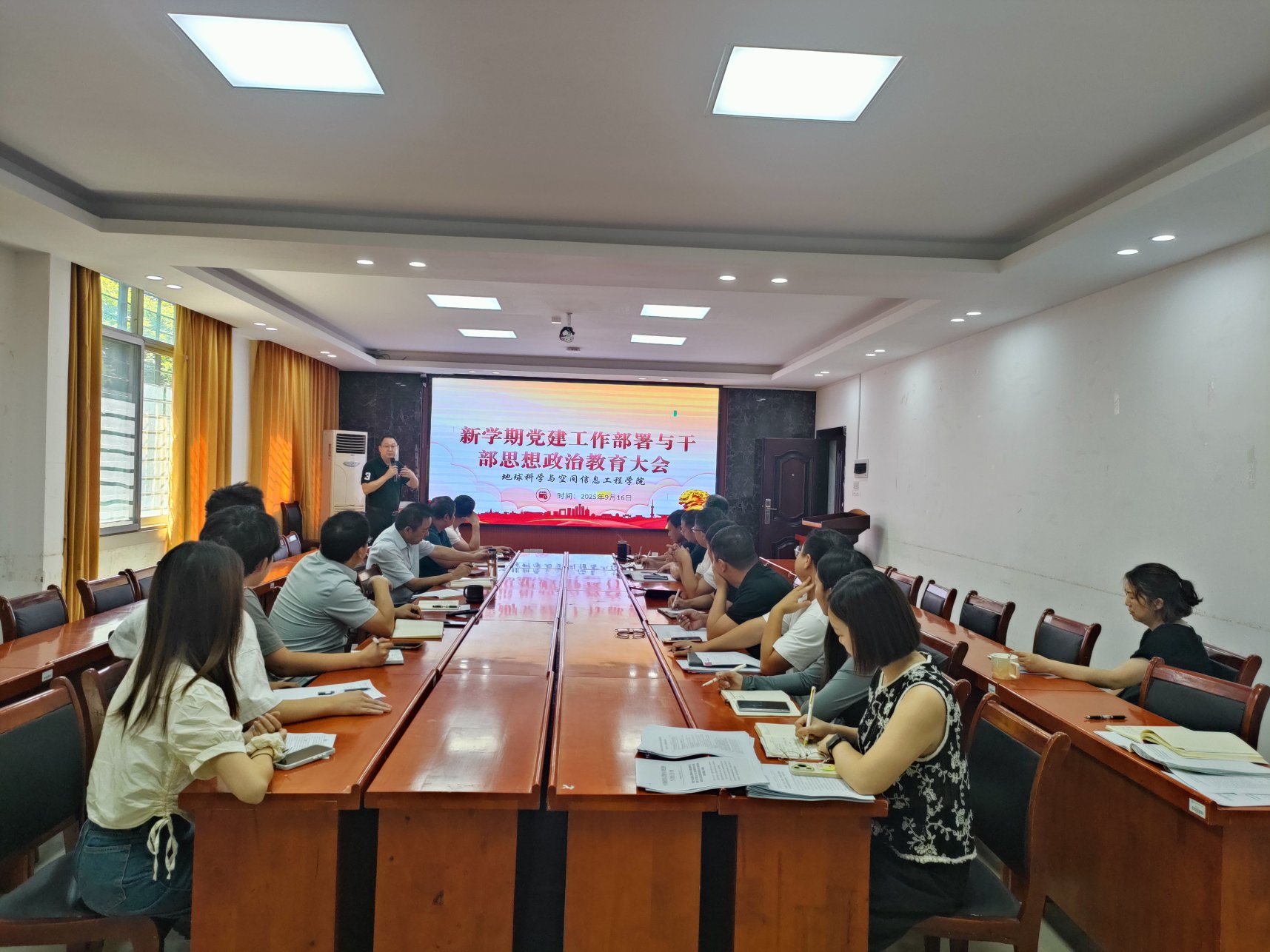 2025年9月16日,秀人网 在地学楼206会议室召开2025年秋季新学期党建工作部署与干部思想政治教育大会。秀人网 党委书记龙四春主持学习会议。秀人网 全体院领导,地理空间信息技术国家地方联合工程实验室副主任、院师生党支部书记、党政办主任、组织员参加本次会议。