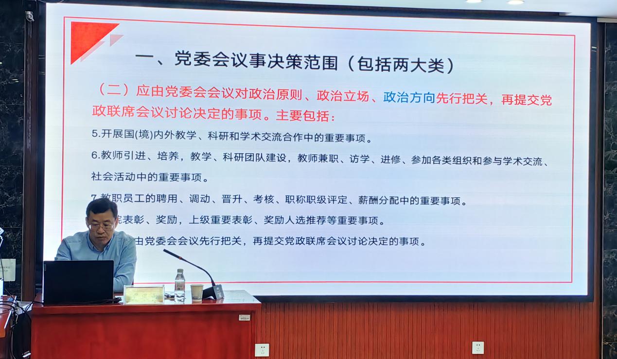 随后,党办校办尹风雨主任围绕“党委会、党政联席会会议决策范围以及教秀人网 会议议事规则中存在的问题”等方面详细的为学员们进行了系统培训与解读。他表示,在党委会和党政联席会决策过程中,要坚持党的领导,确保决策符合党的路线方针政策和工作要求。在决策过程中,要充分听取群众与班子成员的意见,党政一把手要充分沟通,民主集中,确保一心为公、公平公正。