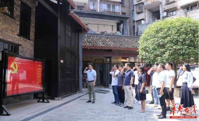 一行人首先参观了八路军驻湘通讯处旧址,缓缓走过展厅,一件件珍贵的历史文物、一张张发黄的照片,把大家带回到当年革命先烈们宣传抗日救国主张,发动群众支援抗战的恢宏场景里。“我志愿加入中国共产党……”陈列馆门口鲜艳的党旗前,在龙四春带领下,全体党员紧握右拳,高举手臂,庄严地重温了入党誓词,回顾了入党时的初心和理想信念,共同追忆革命先烈舍生忘死、共赴国难的艰苦奋斗历程。