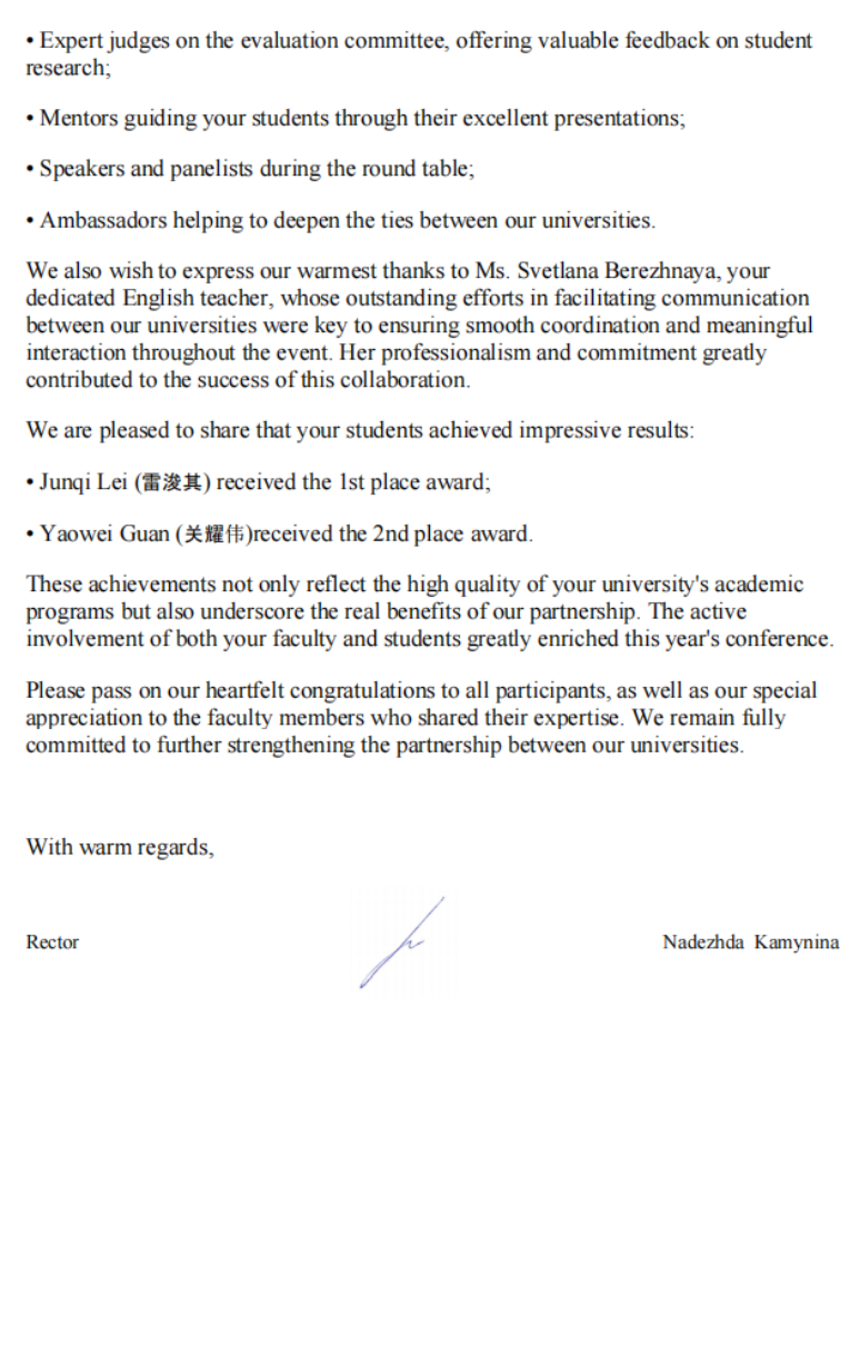 会后俄方发来感谢信