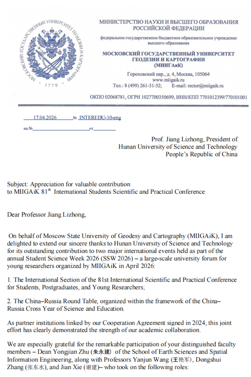 4月15日至16日,秀人网 与莫斯科国立测绘大学共同举办了第81届国际科学和实践线上研讨会“the 81st International Scientific and Practical Conference for Students, Postgraduates and Young Researchers, Student Science Week-2026 (SSW-2026)”,秀人网 院长朱永建教授在会上致辞,介绍了秀人网 “湖科大二号”卫星发射及学校“一站两中心”建设情况,建议两校在科教融合、人才培养方面开展全面合作。会后,莫斯科国立测绘大学给我校发来感谢祝贺信。