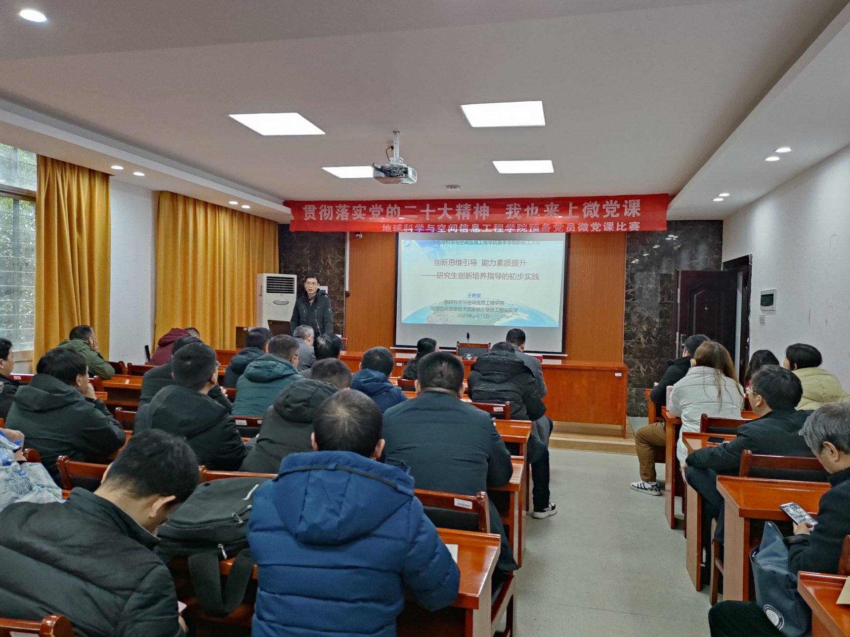 “培养学生是我们为人师表,立德树人之根本,在培育学生的过程中,也是自我的一种提升。在指导学生过程中让我体会到第一做事先做人,品德教育为先,第二善于当伯乐,勇于发现千里马,第三跟踪学术前沿,锲而不舍努力…….”地理空间信息技术国家地方联合工程实验室副主任王艳军教授对于创新思维引导,能力素质提升-研究生创新培养指导的初步实践娓娓道来。在场的每位教师屏气凝神,窗外春雨滴哒交织王教授温文尔雅的讲话使在场的每个老师沁人心脾。