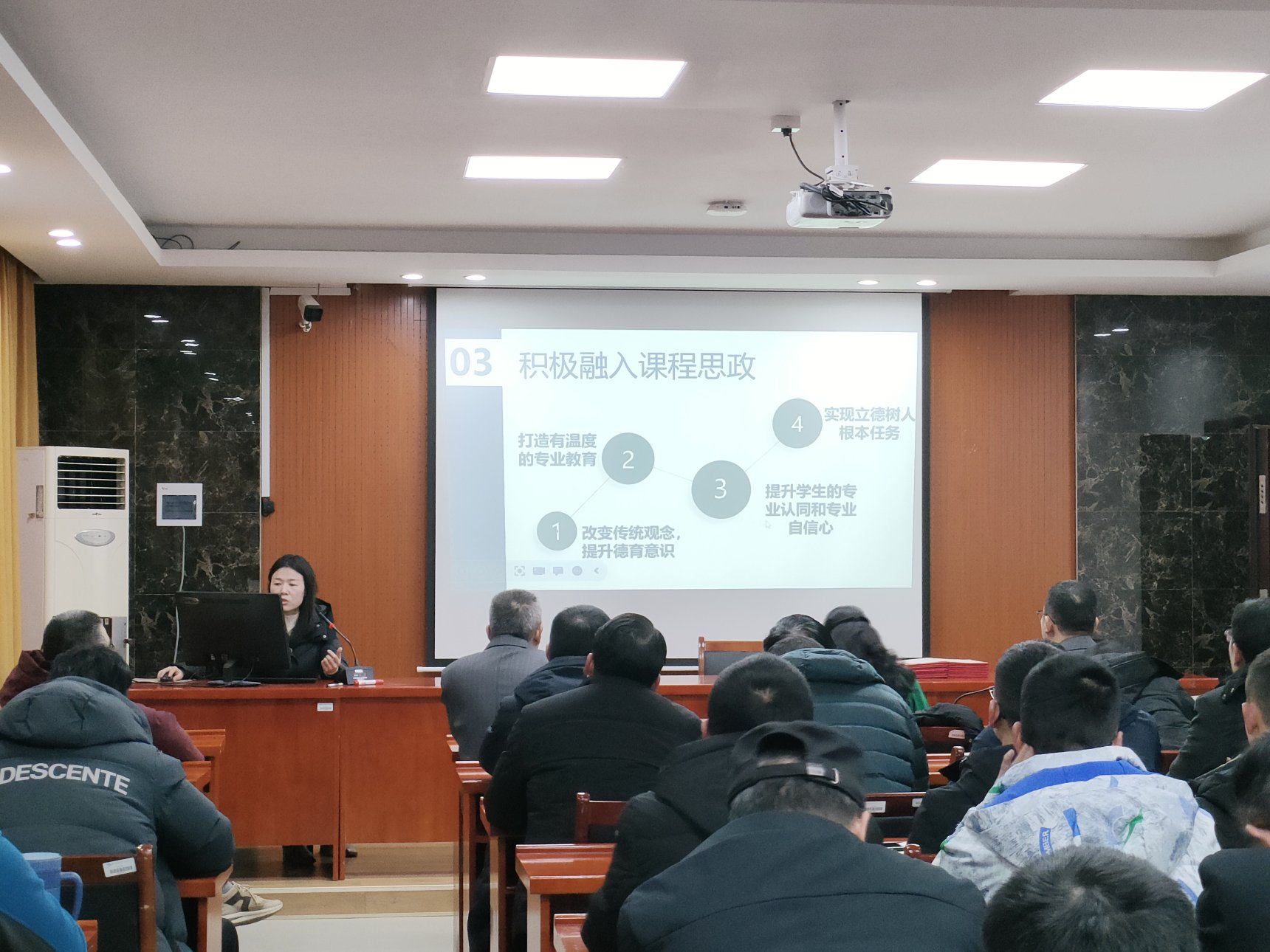 “提升课件质量、学习教学方法、提升教学能力、积累教学成果,别忘了带上我们快乐积极面对的心态……”铿锵有力的发言使得看上去文静、美丽大方的石得凤副教授此刻像极了一个带兵打站的将领。注重平时素材的积累,跟进先进的教学工具有助于我们竞赛的成功。倾情而出、毫无保留的教学经验分享,使在座的每位教师流连忘返于每张PPT。