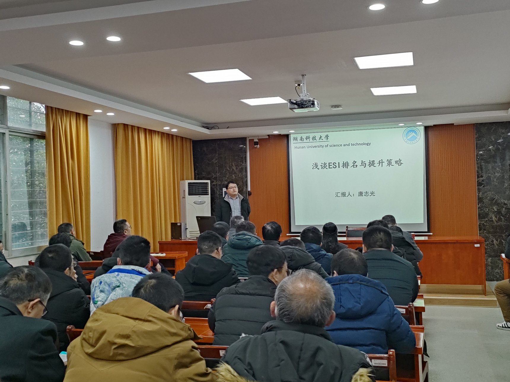 “ESI是公认的衡量世界一流大学和一流学科的 “世界标准”之一,提升ESI学科排名,入围ESI学科排名全球1%已成为高校学科建设的首要目标之一……”对地观测与遥感应用研究所所长唐志光教授从ESI排名的依据及可靠性切入,通过精准数据的引用分析给出学校ESI排名,逆水行舟,不进则退,慢进也退的原理。从“参与高水平团队,联合发表论文、加大研究生培养质量等方面”总结出提升策略之方法。全场一片掌声,经久不息。