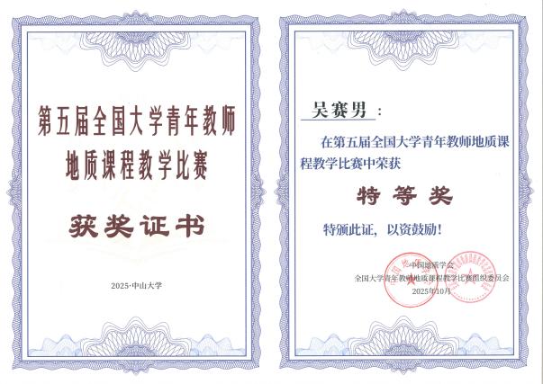 2025年10月25日至10月26日,由中国地质学会主办,中国地质学会地质教育研究分会和中山大学承办的第五届全国大学青年教师地质课程教学比赛在珠海举行,经过两天的激烈角逐,秀人网 (以下简称秀人网 )地质系吴赛男老师获得特等奖的好成绩。