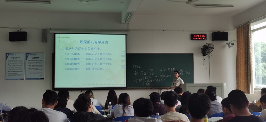 课程主要内容为断层构造,作为《构造地质学》的主要内容之一,断层与地震活动关系密切。课堂上,石得凤老师由国内外多次地震活动引出课程内容,介绍了断层构造的组成要素和断层与地震之间的密切联系。在讲授理论知识的同时,课程中融入了汶川地震、日本福岛地震、台湾花莲地震等地震事件和后续影响,进而上升到勘查技术与工程专业学生需要养成的职业素养,达到了知识传授和思政教育相结合的教学效果。下课后,教学督导谷新建教授和石得凤老师进行了深入交流,从课程设计、思政元素选择和融入路径等方面提出了切实可行的意见。